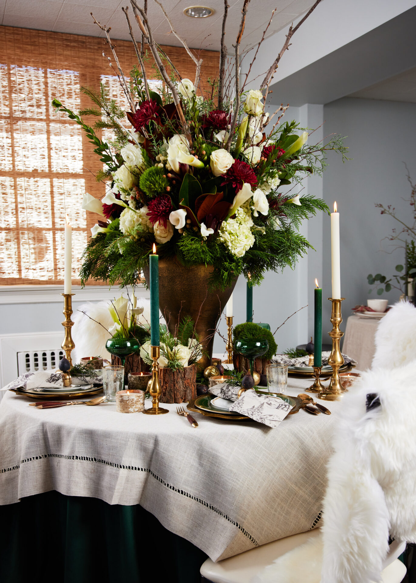The warm indulgence of a luxe après ski retreat, where rustic alpine charm meets elevated sophistication. Deep greens, winter white blooms, and textured woods that evoke a chic mountain lodge, and brass, fur, and candlelight add cozy glamour. Natural elements paired with refined place settings that bring to life that perfect après slope moment… inviting, festive, and effortlessly elegant.